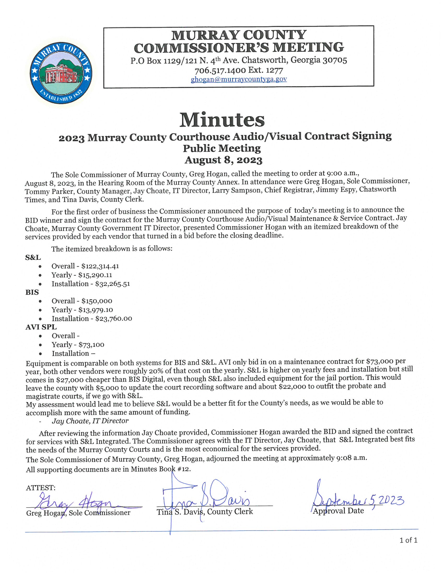 Murray County Commissioner Minutes - August 8, 2023 M.C. Courts Contract Signing Minutes