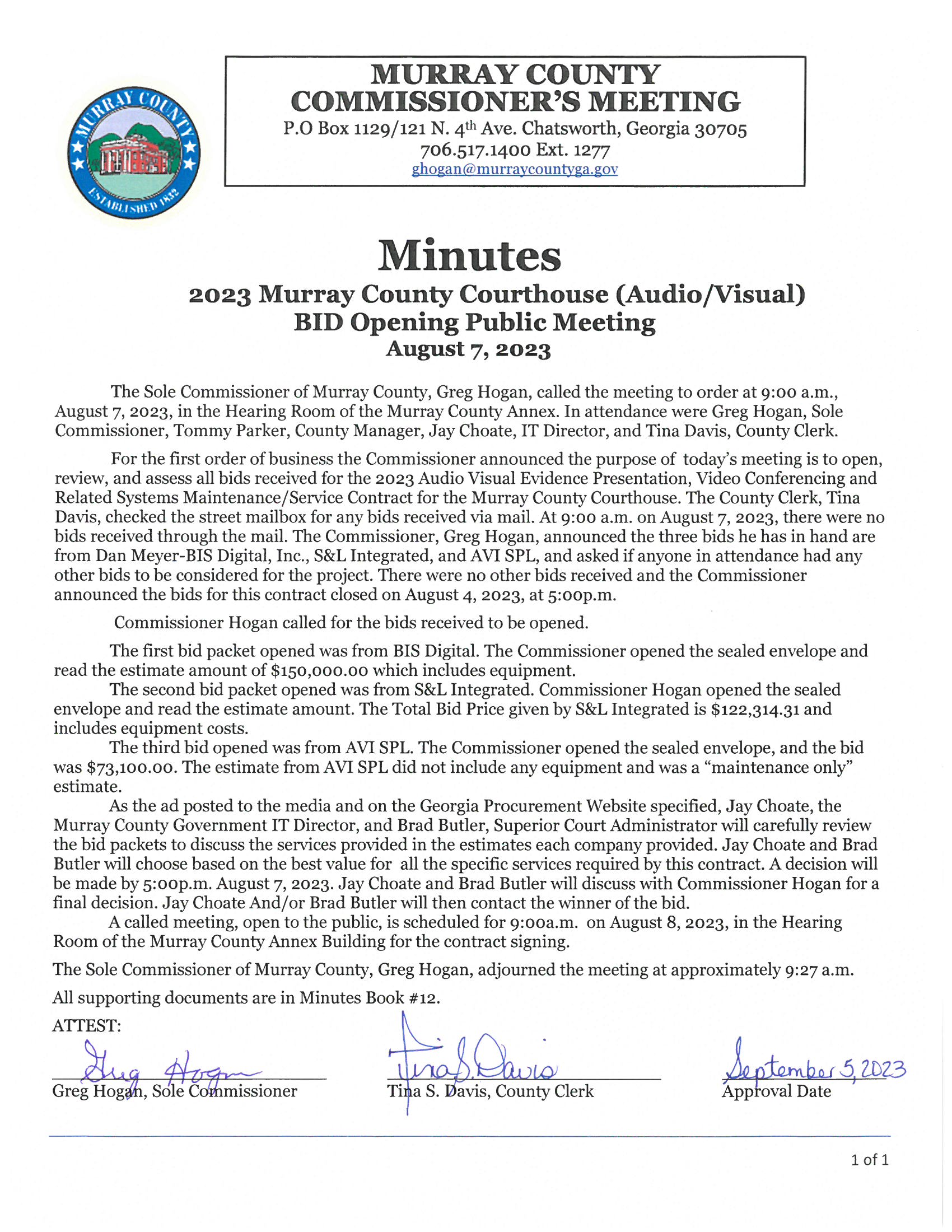 Murray County Commissioner Minutes - August 7, 2023 M.C. Courts BID Opening Minutes