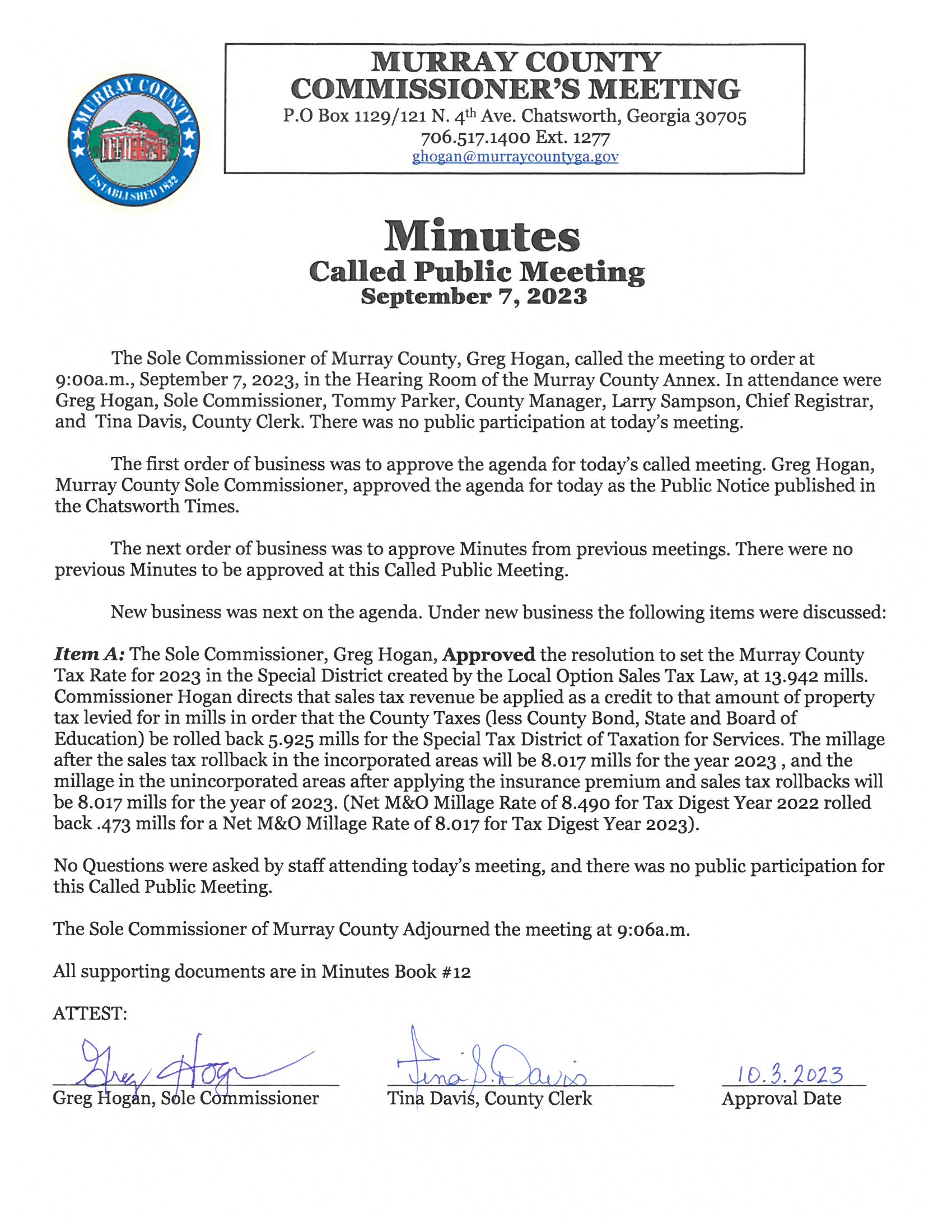 Murray County Alcohol License Hearing Approved Minutes-September 2023